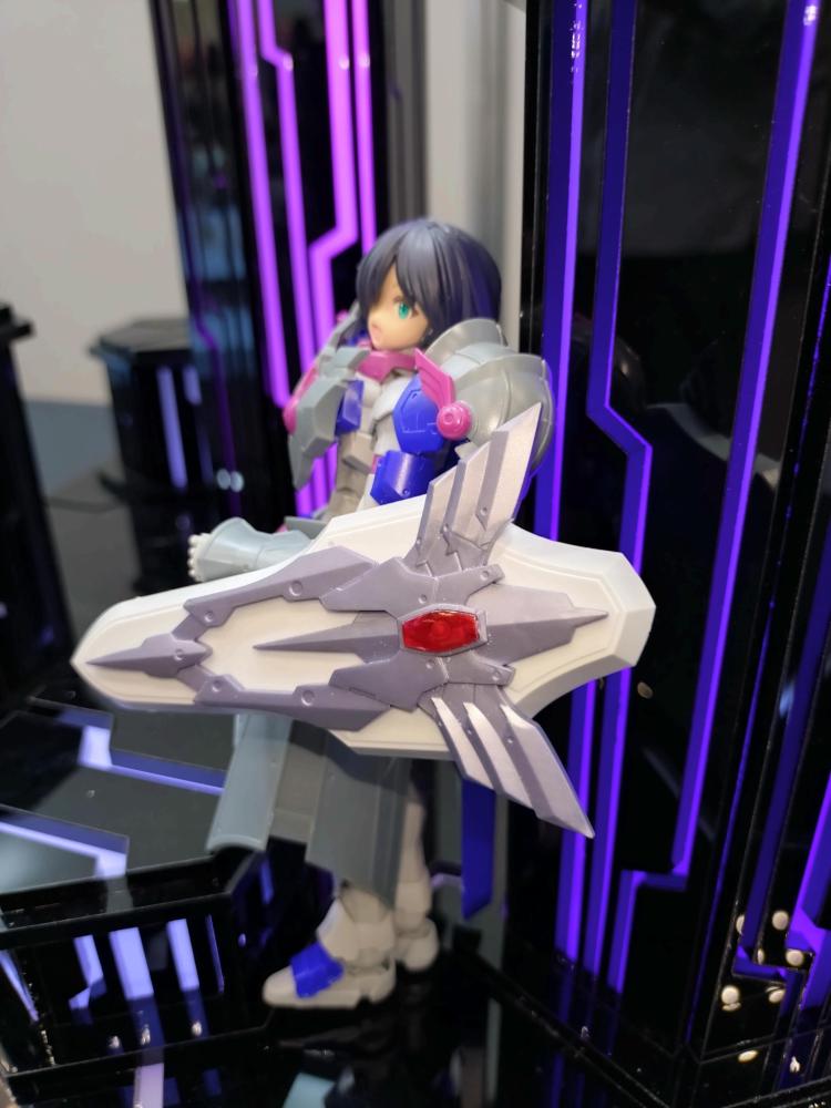 パラディンアーマーと武装は、めぐるから流用したものを基本にアズレアホーリーナイトを混ぜ、シールドにあるクリアパーツのみガンダムマーカーで赤く塗装しました。ピンクと青、白の組み合わせは、大阪モノレール2000形・3000形からヒントを得たものです。
